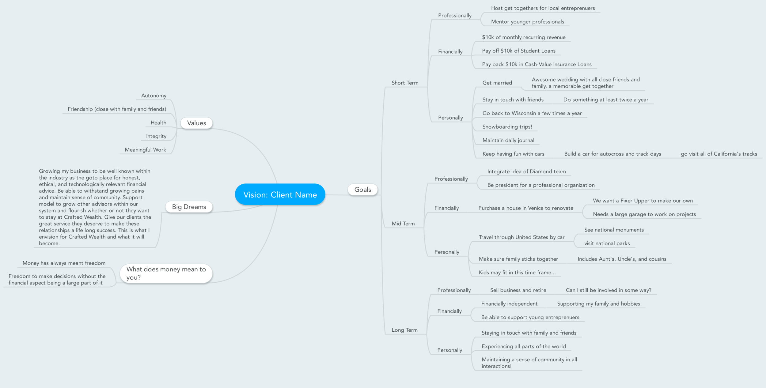 As part of our process we will help you rediscover and refine your values around life and money. We work to ensure your values tie into each of your financial goals using our unique mindmap process.